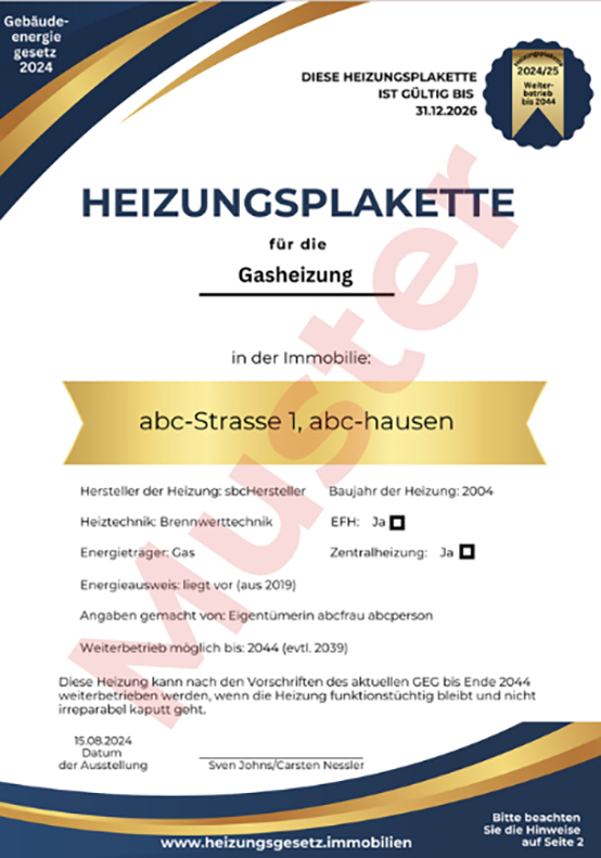 Dafür schicken Sie uns ein Bild Ihrer Heizung, machen einige Angaben in unserem interaktiven Bestellformular und erhalten dann von uns die Heizungsplakette. Aus der Heizungsplakette geht hervor, für welche Heizung, welchen Energieträger, welches Baujahr, welche Heiztechnik und für welchen Standort diese Heizungsplakette ausgestellt worden ist.
